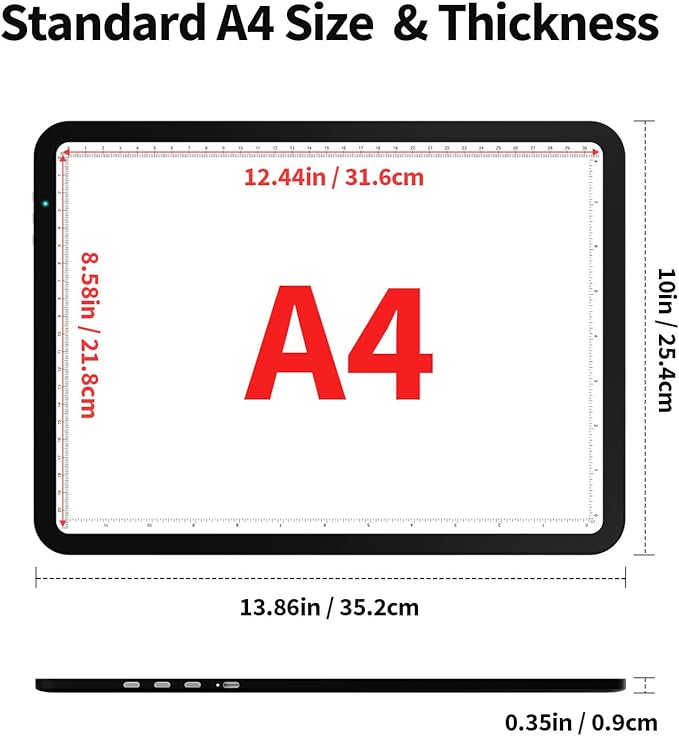 - 【Good for Your Eyes】The Tracking light box maximum brightness up to 9000LUX,Meet your various uses.Our light source is both soft and uniform, effectively safeguarding your eyes from potential harm. This A4 light table is entirely free of luminous spots or strobing effects. Thanks to our advanced eyesight - protecting technology, you can use the tracing light for extended periods without any adverse impact on your eyes.