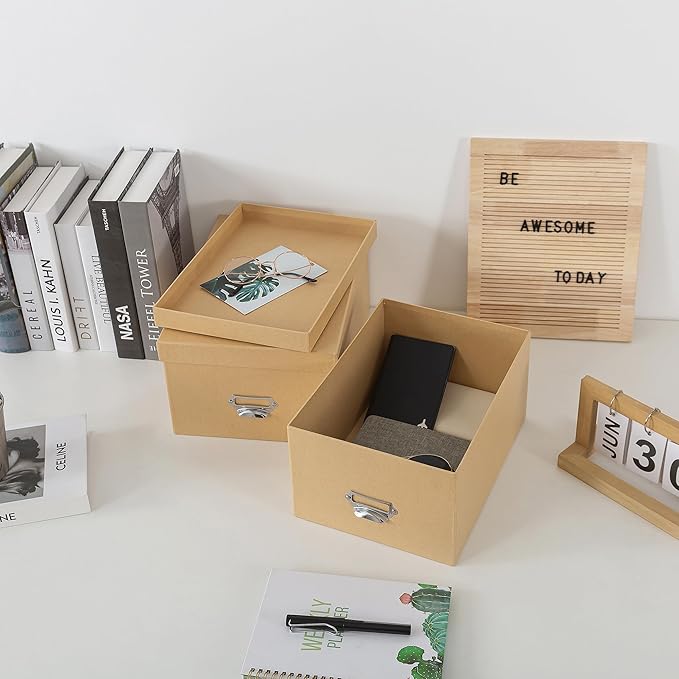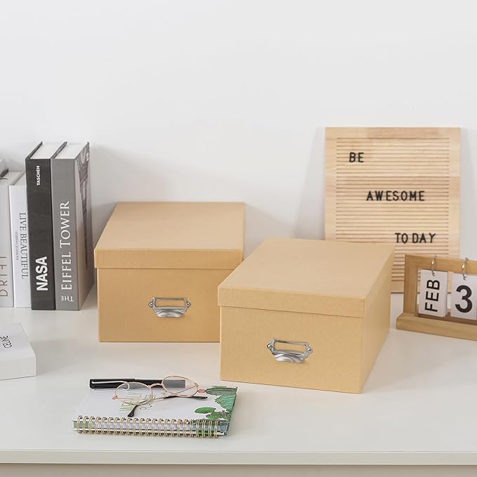 - SLEEK VINTAGE AESTHETIC: Elevate your home or office decor with these kraft keepsake boxes with lids. Featuring a natural paperboard finish and silver label holders, they blend seamlessly with any interior while providing functional storage. The classic kraft color adds a touch of vintage charm to any space.
