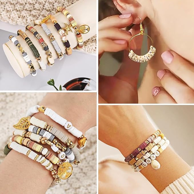 - 【Perfect Bracelet Making Kit】 All you need included,about 6000 pcs flat polymer clay beads and about 443 pcs charms kit( contains white letter beads, white number beads, sport and fruit polymer clay beads,gold rice beads,gold square beads, gold flat beads, gold spacer beads,gold silver charms, lobster clasp, ear hoop,open ring,pearl beads,etc.),1 rolls 5m stretchy strings, This complete expansive jewelry making kit is filled with endless possibilities to be imaginative, to meet all your needs for bracelet making & jewelry making.