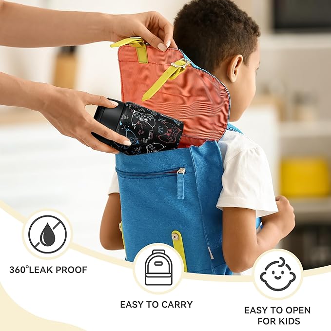 - KID-LOVED DESIGNS & HASSLE-FREE USE - Choosesleek solids (Black, Ice Blue, Lilac, Pink) or fun prints (Game Console, Dinosaurs, Unicorns, Rainbow). Simple screw lockallows easy adult-assisted opening. Officially recommended for ages 3+. Easy to enjoy a healthy lunch!