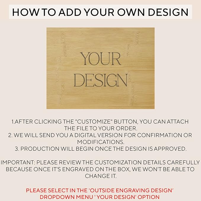 - Customizable: Our personalized memory box can be engraved with various designs we offer, along with your name, date, or a short phrase. The font will match what’s shown in the photos unless you indicate other preferences. Additionally, the inside lid's side can be engraved with your own text in different fonts we offer.