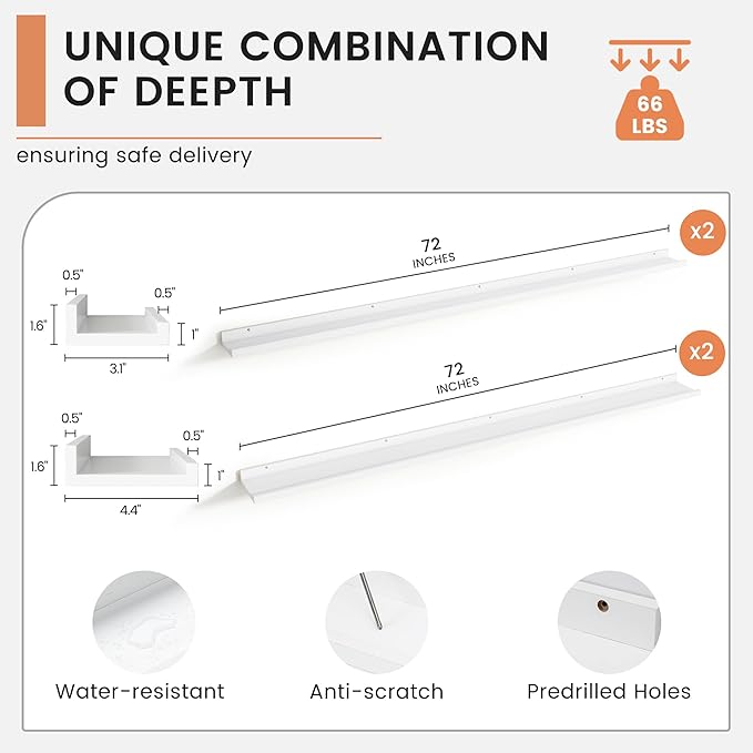 Floating Picture Ledge Shelves for Wall Set of 4, 72 Inch Wall Shelves with Lip Long Large Nursery Book Shelf for Toys Storage Kids Bookshelf Wall Mounted Living Room Bedroom Decor Frames