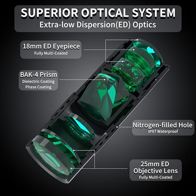 - PREMIUM OPTICS: 10x25 magnification monocular with ED glass, BAK-4 prism, fully multi-coated lenses for exceptional clarity and brightness