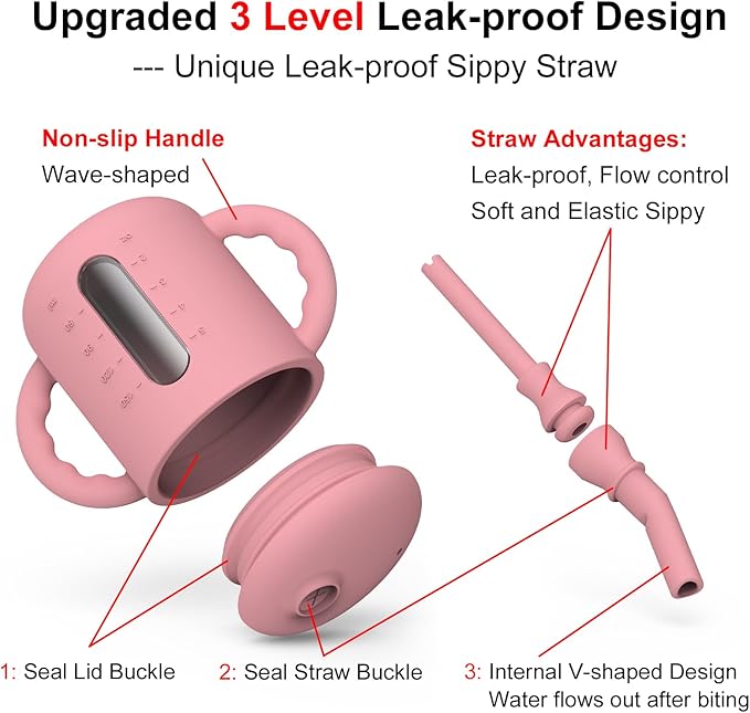- Leak-proof Straw Cup: 3 levels sealing structure, seal lid buckle + seal straw buckle + internal V-shaped lock, no leakage when inverted/shaken. It is more convenient for babies to drink water independently.