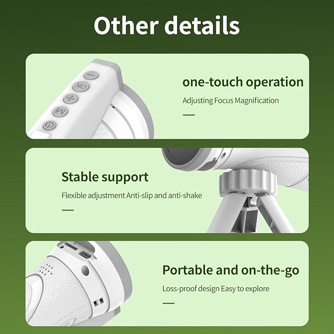 - 32GB STORAGE CARDS:Comes with a 32GB memory card, enabling you to store high -quality photos and videos directly. With this telescope, the park becomes a “nature lab” right at their doorstep! Kids can use the telescope to watch ants marching, butterflies fluttering, or even discover insects hidden among leaves. On weekend trips, the telescope helps them see distant mountain ridges, ripples on lakes, and sparks their curiosity about nature.
