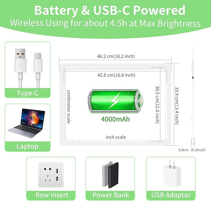 - [Long-Lasting 4000mAh Battery & Fast USB-C Charging]: Portable A3 light table with 4+ hours runtime at max brightness (8+ hours at medium). Recharge via universal USB-C in 3.5 hours – compatible with laptops, power banks, and car chargers. No more cable clutter! Stable USB-C port outperforms fragile micro-USB, ideal for on-the-go crafting