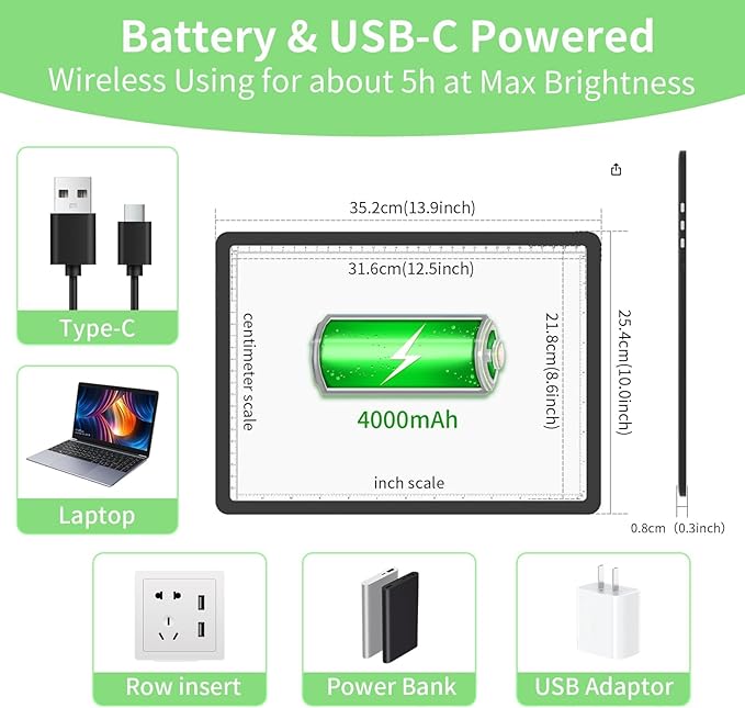 - [Long-Lasting 4000mAh Battery & Fast USB-C Charging]: Portable A4 light table with 4+ hours runtime at max brightness (8+ hours at medium). Recharge via universal USB-C in 3.5 hours – compatible with laptops, power banks, and car chargers. No more cable clutter! Stable USB-C port outperforms fragile micro-USB, ideal for on-the-go crafting
