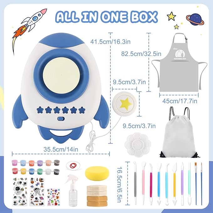 - Complete Pottery Wheel for Kids Kit: This pottery wheel set comes with 4 packs of air-dry clay, 12 vibrant paints, 2 brushes, sculpting tools, a sponge, a palette, an apron, a storage bag,a cutting wire, and fun stickers. A one-stop shop to meet your kids creative needs from shaping to coloring and to stimulate artistic potential. Create your own original piece of artwork.