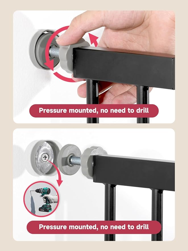 - Easy to Install and Wall Friendly: The pressure mounted baby gate is easy to assemble and disassemble. It is sturdy, durable, convenient, and doesn't require drilling or tools, which can protect your walls from damage and keep the wall clean and intact even after the baby door is removed. You can remove it at any time when not in use and it can be reused. (Measure the installation distance of the upper and lower walls. Make sure the door is betwwen 29.5 9-40.5" wide)