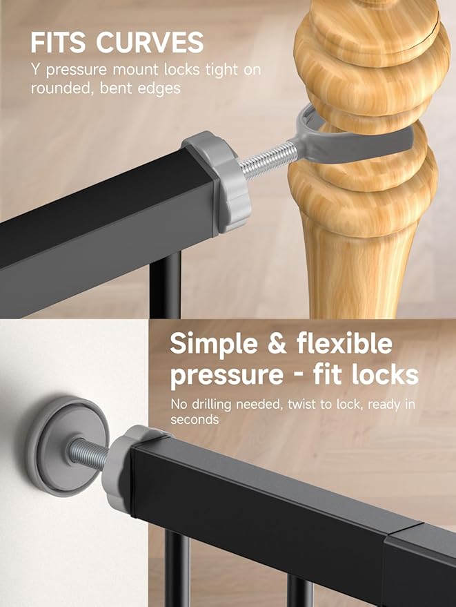 - Keep Your Little Ones and Pets Safe: The extra tall baby gate for stairs is made of all-metal structure, it can withstand impacts from pets. Don't need to worry about baby gates with door being pushed down and hurting your children or dogs. The pet gate is chew-proof, lead-free and non-toxic, providing a secure barrier wherever you need it. Ideal for a family with children and pets