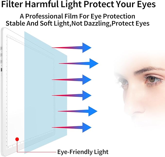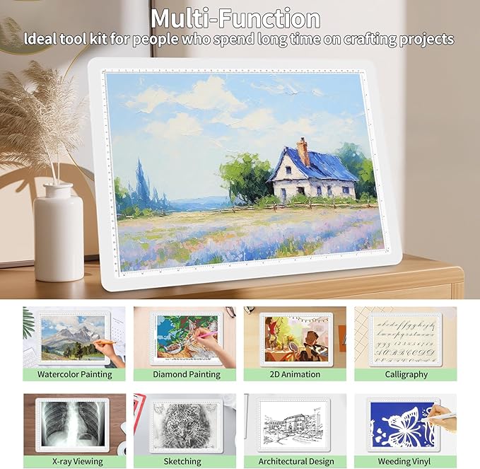 - 【3 Light Color Modes and 6 Levels/Stepless Dimming】This lightpad supports 3 colors of white light, natural light and warm light. Each lighting mode has 6 brightness dimming options. By shortly press the physical button to choose 6 levels brightness OR by long press the physical button to stepless adjust brightness. The Drawing Lightbox MAX brightness reach to 5400 Lux in the surface, which is great tool for cricut weeding vinyl. The light is even, non-glaring, no more eye fatigue when painting.