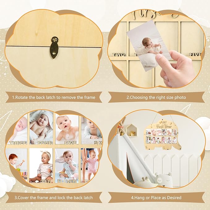 - SIZE & MATERIAL: My first year milestone board size 11.9" high x 13.4" wide, made from 2/5" thick premium wood,smooth and reusable,not easy to fade or peel.fits 1.8" x 3" photos (Wallet Size),easy to use.