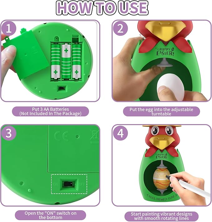 - Easy to Use: The Easter Egg rotator Kit is an essential gifts for children's growth. It's easy to use, just Installing 3 AA batteries on the bottom (not included in the package). Put the egg into the spinner and jam the egg, turn on the "ON" switch on the bottom, let the spinner spin to start painting vibrant designs with smooth rotating lines