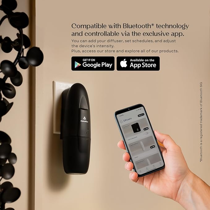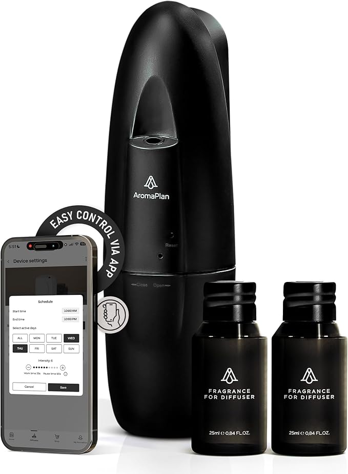 - EASY TO SET UP WITH CUSTOMIZABLE SETTINGS – This new scent diffuser is compatible with Bluetooth technology (Bluetooth is a registered trademark of Bluetooth SIG) and is controlled through the AromaPlan App, available for iOS and Android. It is possible to create multiple advanced schedules (days of operation, specific times, fog intensity, work time, and break time)