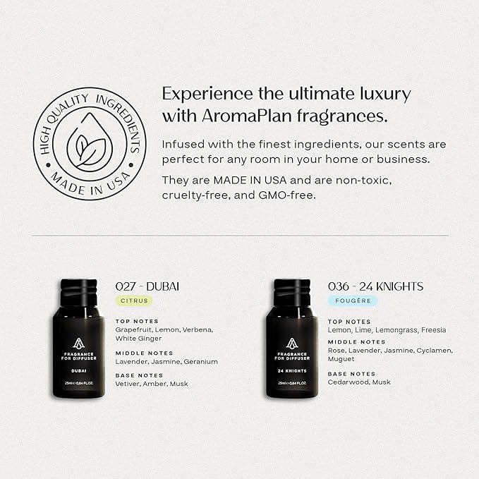 - LUXURIOUS WATERLESS PLUG-IN DIFFUSER WITH 2 FRAGRANCES – The AromaPlan Authentic 2025 Upgraded Plug-In Diffuser uses advanced NT10x nanotechnology to transform liquid fragrance into dry, vaporous microparticles, evenly scenting spaces up to 500 sq ft without water or oily residue. This set includes 1 Plug In + 2 bestselling 25ml fragrances—Dubai & 24 Knights—delivering fresh, invigorating scents.