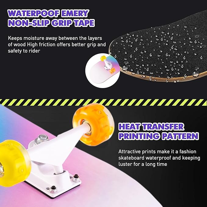 - Patterns Design: Personalized pattern design on the board is quite creative and eye-catching, you will definitely stand out among your friends across the different age range. Also, Skateboards pattern printed with thermal transfer printing process allows greater print durability, lasts much longer.