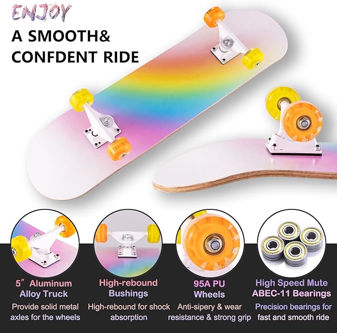 - Smooth and Speedy:The cruiser skateboard features Anti-Slippery 54mm 95A High-Rebound PU wheels, High-Speed mute ABEC-11 precision bearings and PU shock bushings give you better balance control, shock absorption effect and a better skateboard experience. It’s suitable for commuting, skate parks, ramps, pools and other smooth surfaces or even rough ground.