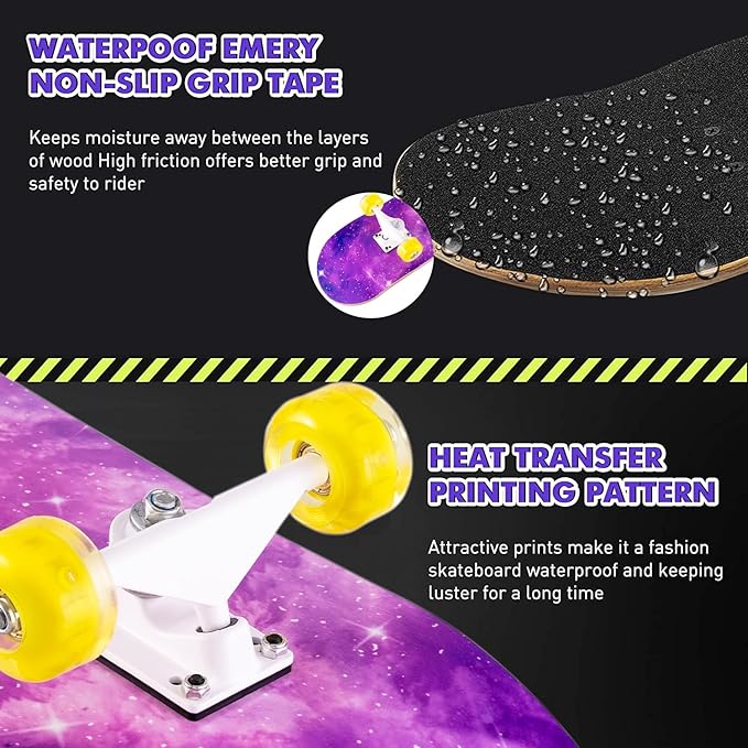 - Patterns Design: Personalized pattern design on the board is quite creative and eye-catching, you will definitely stand out among your friends across the different age range. Also, Skateboards pattern printed with thermal transfer printing process allows greater print durability, lasts much longer.