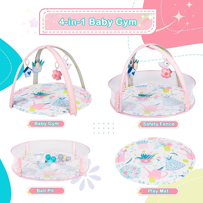 Baby Play Mat, 4-in-1 Baby Play Gym Tummy Time Mat with Ball Pit and 5 Detachable Toys for Newborn to Develop Sensory Exploration and Motor Skill 0-6-12 Months