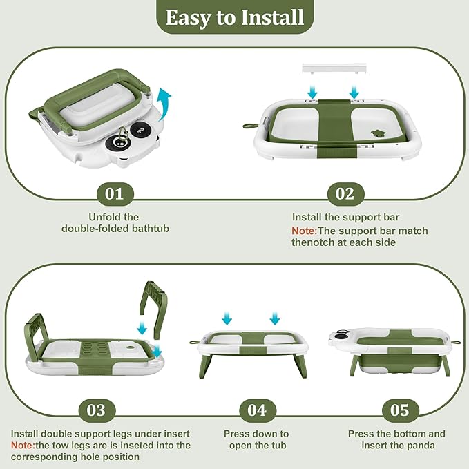- Double-Fold & Detachable Leg Support: Our collapsible baby bathtub features an ingenious double-fold design, it even folds in half, folding the body into a square with a thickness of 4 inches. Convenient for storage and saving space!