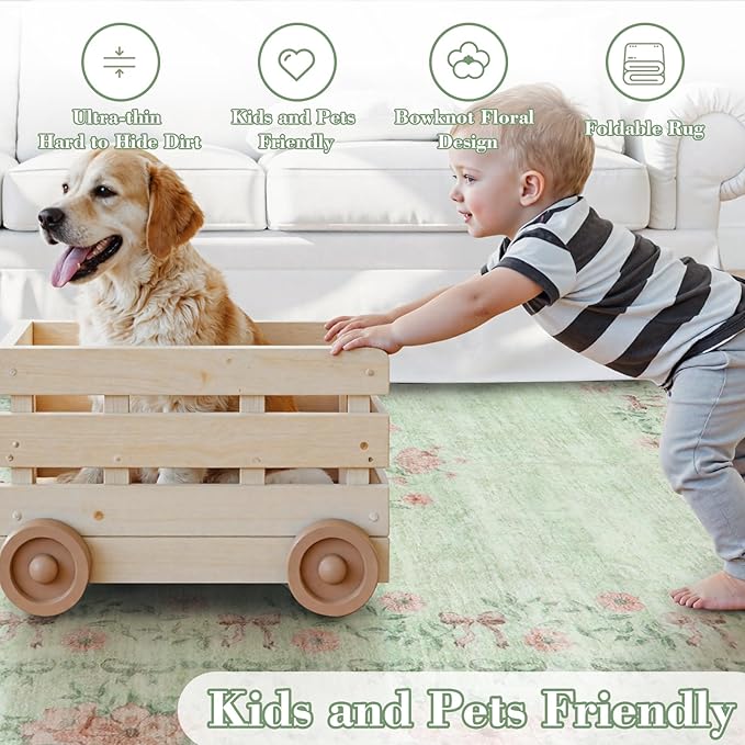Wonnitar Green Area Rug for Living Room, Floral Bow 8x10 Washable Rug, Ultra-Thin Non Shedding Soft Boho Carpet for Bedroom Dining Room Playroom Dorm, Light Green