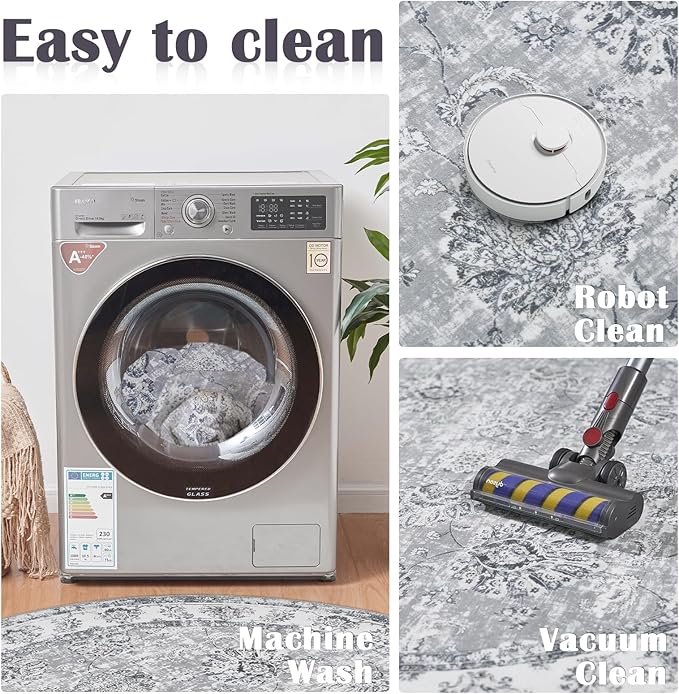 jinchan Round Rug 8ft Area Rug - Grey Vintage Floor Mat Kitchen Indoor Ultra-Thin Soft Floral Print - Washable Circle 8' Retro Accent for Farmhouse Non Slip Dining Room Living Room Bedroom Office