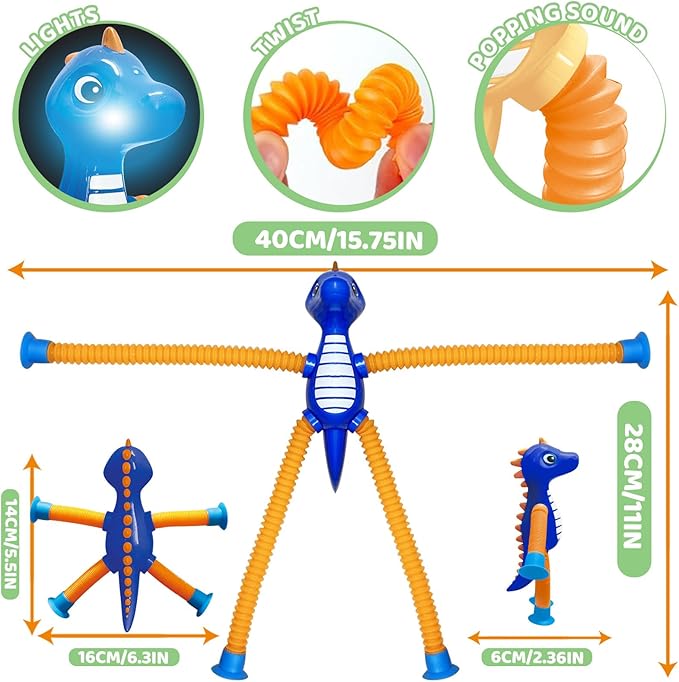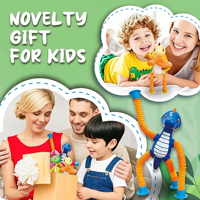 - 👼✨ 【FUN SENSORY TOYS FOR KIDS】: These all new design brightly colored dinosaur animal pop tube toys offer more than meets the eye. With pop tube arms and legs featuring uneven textures and satisfying popping sounds, they engage kids' senses and promote motor skill development. The added telescopic suction cup limbs enable them to attach to flat surfaces like windows or desks, introducing a new dimension of play and tactile sensation.