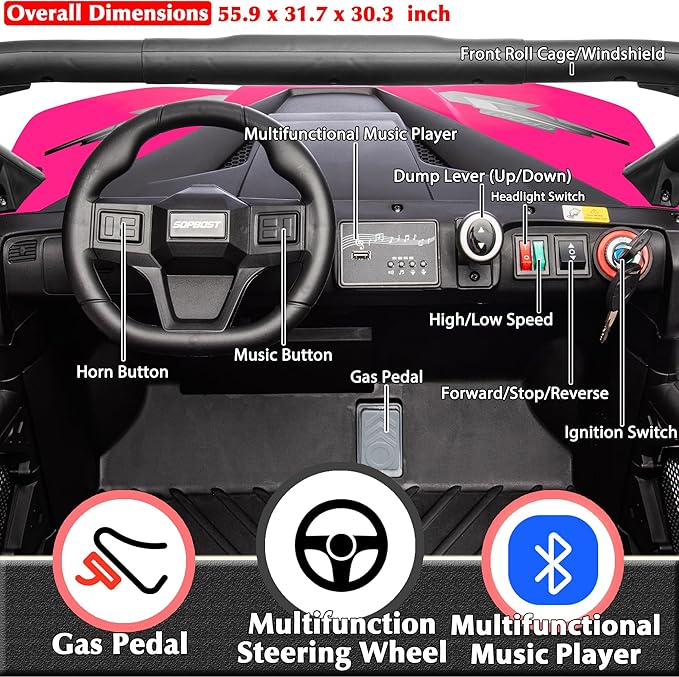 sopbost 24V Ride On Car with Remote Control 10Ah Battery Powered Ride On Toy for Big Kids to Drive 2 Seater UTV with Large Dump Bed, 4x75W Motors, Hot Pink & Black