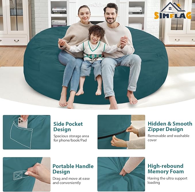 - CONVENIENT DESIGN: SIMFLAG bean bag sofa design with 4 thoughtful details, firstly, a pull-tab makes the bean bag chair easy to move around and manipulate. Second, an inter linner can contains the bean bag and allows you to wash the outside cover without spilling the beans. Third, a medium-sized pocket for your stuff. Fourth, a hidden zipper can prevent scratches to a people's delicate skin.