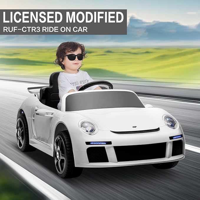 Licensed RUF CTR3 12V Kids Electric Car with Parent Remote Control, 2 Motors, 3 Speeds, LED Lights, MP3 Player | Battery Powered Ride-On Toy for Kids to Drive - White