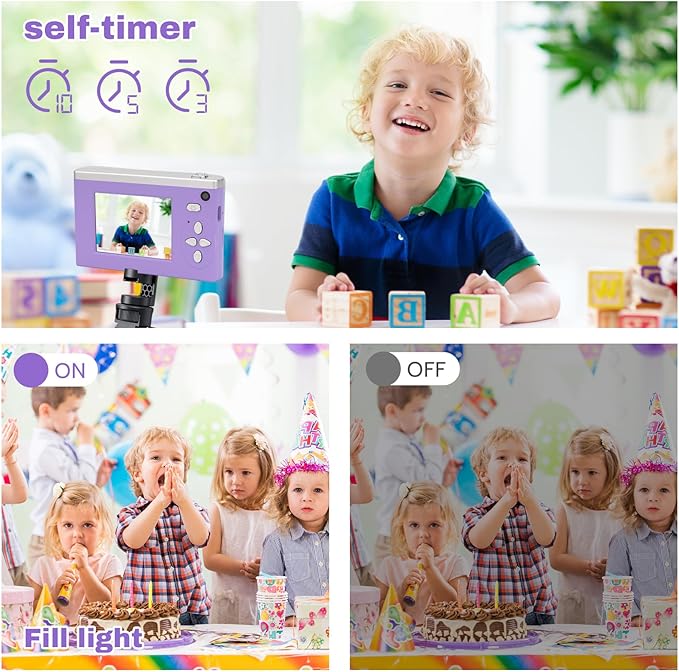 - 【Kid-Friendly Timed Shooting Mode】 Spark creativity with a simple timed shooting function, letting young photographers capture selfies, group photos, or dynamic action shots with ease