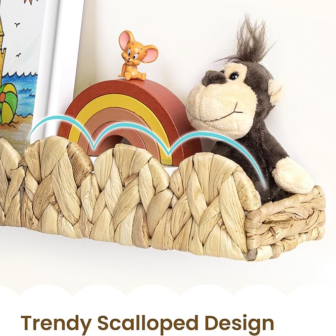 - Versatile & Scalloped Design: Upgrade your child's space with AELS water hyacinth shelves—ideal for lightweight books, toys, and decorative items. Flip them upside down for fresh looks in any room, from nurseries to playrooms. Woven beauties blend style and function.
