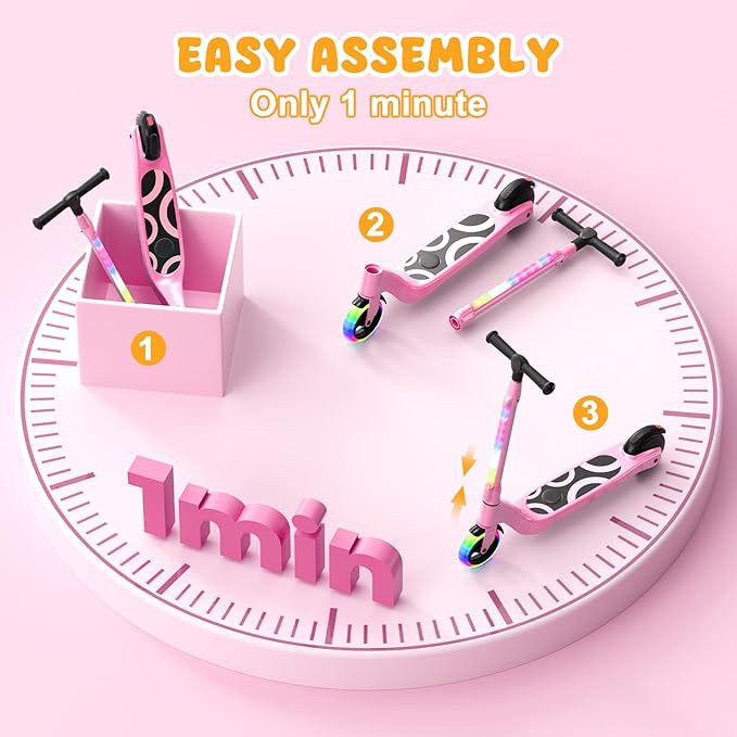 - High Quality Tire Design: Kids electric scooter is equipped with flashing wheels and headlights, which emit colorful light during riding; the dual-function design of the rear wheels as both fenders and foot brakes facilitates quick deceleration, and easy stopping or slowing down when needed, which makes it safer for kids to play.