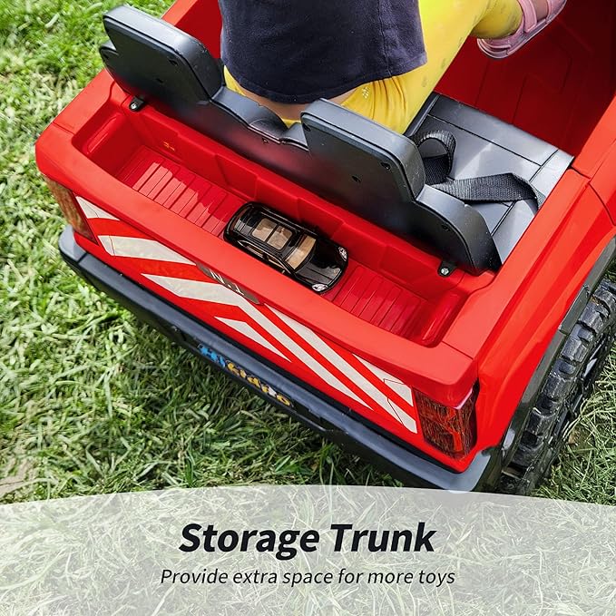 - 19" DUAL SEATER : This battery powered police kids car has ample seater, allowing two children to ride together comfortably under 110lbs. Adjustable seat belts and double-locking door design also ensure kid's safety.