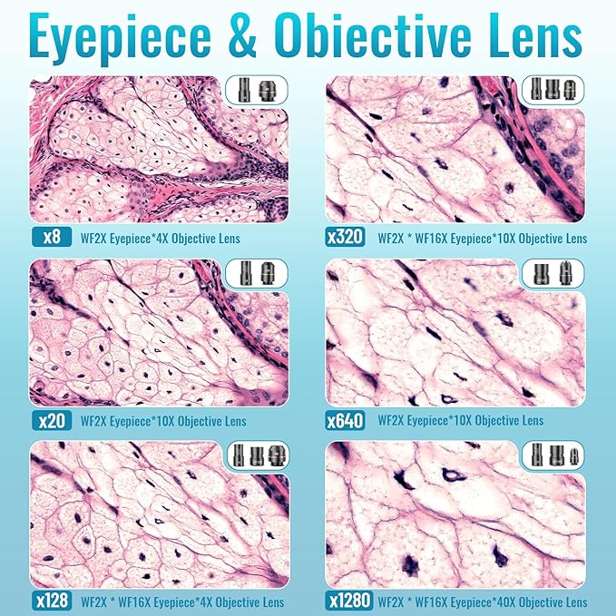 - Multiple magnification options:Equipped with a 2X magnifying glass, when used with a wide-angle eyepiece, the 16X eyepiece can become a 32X effect. It can also be used with objective lenses of different magnifications, 4X, 10X, 40X, to meet various needs, up to 1280X magnification