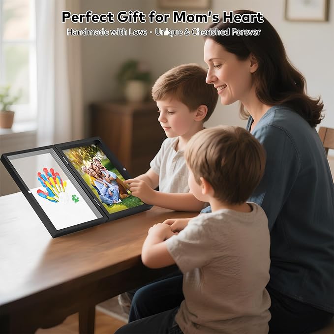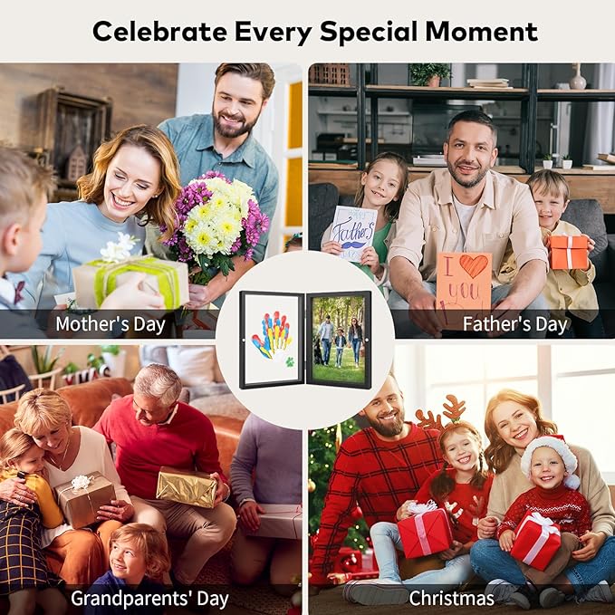 - DUAL DISPLAY MODES & PHOTO AREA: Our upgraded keepsake frame also have a photo frame feature, the photo side is big enough to hold one large photo or several smaller ones. Imagine this framed treasure on your living room wall: your toddler's tiny hand nestled in yours, surrounded by family photos that spark conversations for generations