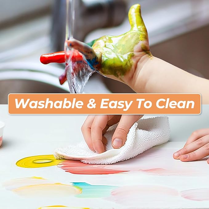 - Washable & Easy to Clean – These water-based paints wash off hands, clothes, furniture, and most surfaces with just soap and warm water—no scrubbing needed. Paired with no-spill cups, they keep cleanup quick and stress-free at home or in class.