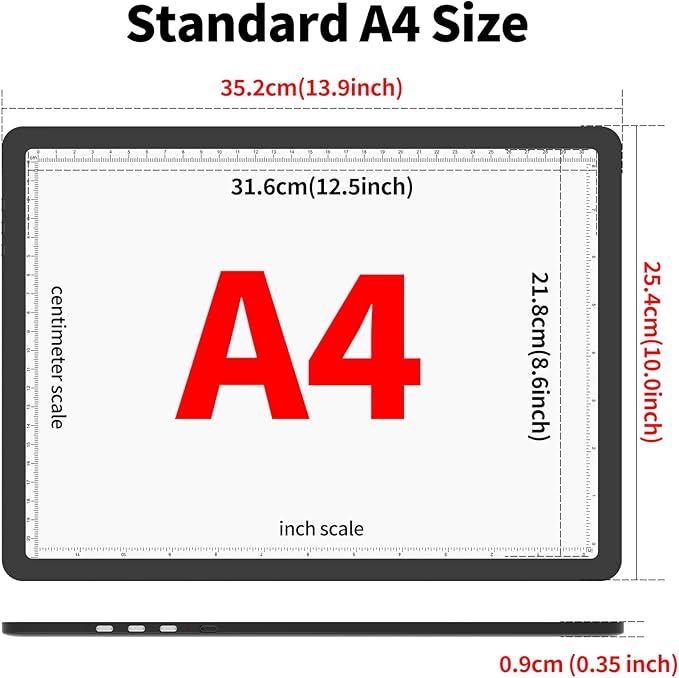 - 【 Standard A4 size, CM-INCH double scale 】 This super bright lightpad Overall Size is 35.2 x25.4 x 0.9 cm ( 13.9 x 10.0 x 0.35 inches ), and the visual working area is 31.6 x 21.8 cm ( 12.5 x 8.6 inches ). Illuminated area large enough for international standard A4 paper. This Light Drawing Sketch Pad has a dual scale of centimeters and inches to meet your various usage habits.
