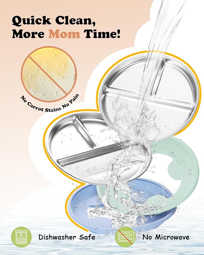 - Hassle-Free Cleaning: Resistant to food stains like carrots, the smooth stainless steel surface is easy to clean. Both the toddler plate and silicone suction sleeve are dishwasher-safe, making cleanup quick and stress-free for busy parents