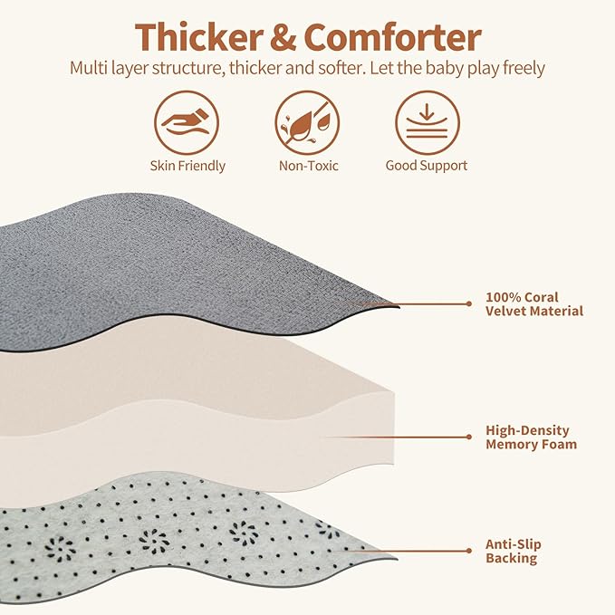 - 【1.4in Thickened Memory Foam Play Mat】Made with ultra-soft velvet fabric and premium high-density memory foam, this play mat provides a plush and comfortable surface for babies and toddlers. At approximately 1.4 inches thick, the SUNYRISY nursery mat offers excellent cushioning to absorb impact, protecting little ones as they crawl, sit, and play. The breathable, fade-resistant material ensures lasting comfort and durability