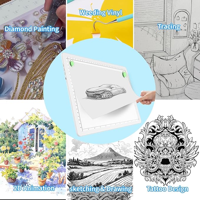 - 【3 Light Color Modes and 6 Levels Dimming】This lightpad supports 3 colors of white light, natural light and warm light. Each lighting mode has 6 brightness dimming options. By short press the physical button to choose 6 levels brightness. The Drawing Lightbox MAX brightness reach to 11000 Lux in the surface, which is great tool for cricut weeding vinyl. The light is even, non-glaring, no more eye fatigue when painting.