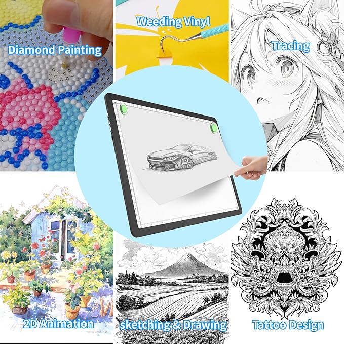 - 【3 Light Color Modes and 6 Levels Dimming】This lightpad supports 3 colors of white light, natural light and warm light. Each lighting mode has 6 brightness dimming options. By short press the physical button to choose 6 levels brightness. The Drawing Lightbox MAX brightness reach to 11000 Lux in the surface, which is great tool for cricut weeding vinyl. The light is even, non-glaring, no more eye fatigue when painting.