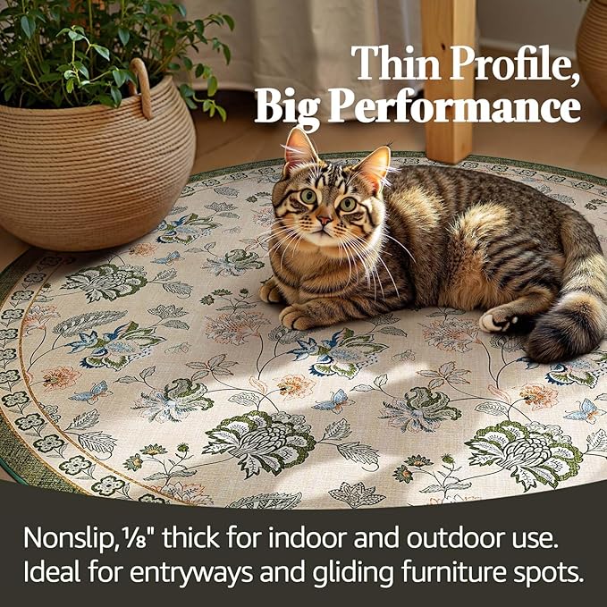 jinchan 8ft Floral Round Rug for Dining Room Washable Living Room Rug Vintage Romance Design Non Slip Indoor Floor Cover Lightweight Low-Profile Throw Carpet for Bedroom Porch Patio, Green/Beige