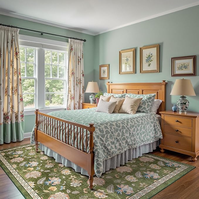 jinchan 8x10 Floral Rug for Living Room Washable Bedroom Rug Vintage Romance Design Non Slip Thin Indoor Floor Cover Large Low-Profile Throw Carpet for Dining Room Office, Green
