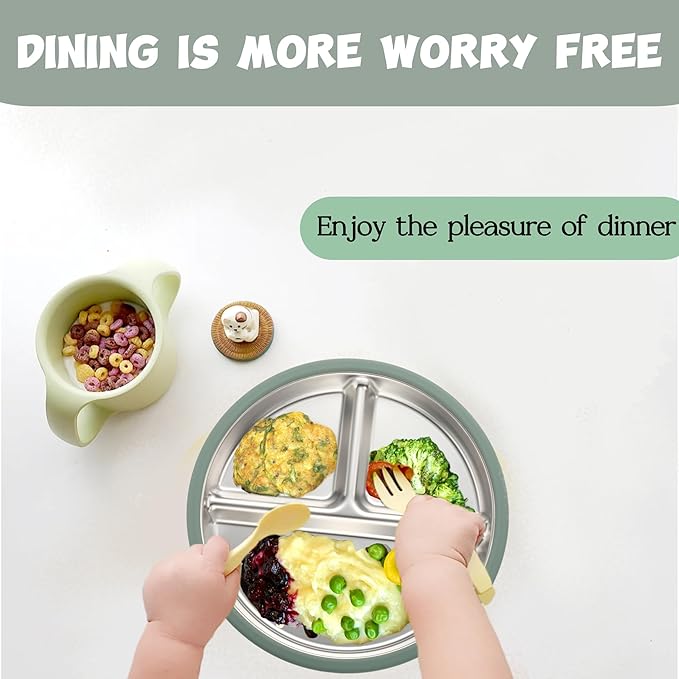- 【Designed for Kids】This baby plate with suction combines durable 18/8 stainless steel with a Food-grade siliconesilicone suction base featuring 4 strong non-slip suction cups. Keeps plates in place on highchair trays or any flat surface for an extra secure grip that won’t budge, helping your child self-feed and minimizing mealtime mess. Say goodbye to flipped toddler plates and hello to free hands for mom!