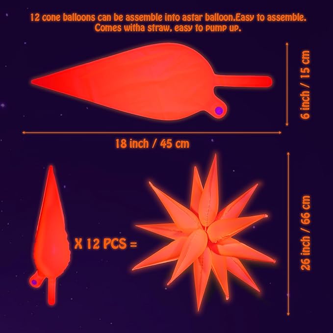 - 【 GLOW IN THE DARK PARTY SUPPLIES 】: Neon Fluorescent Fuchsia, Orange, Lemon Yellow, Tangerine Red and Light Blue Star Balloons Kit, extra large size 26 inches, perfect for glow neon birthday party decorations. You can mix & match to create your perfect color combo.