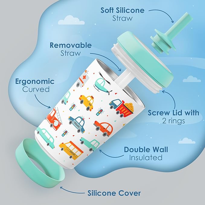 Kid Insulated Stainless Steel Tumbler with Silicone Straw, 12oz Sippy Cup for Kids (Transportation)