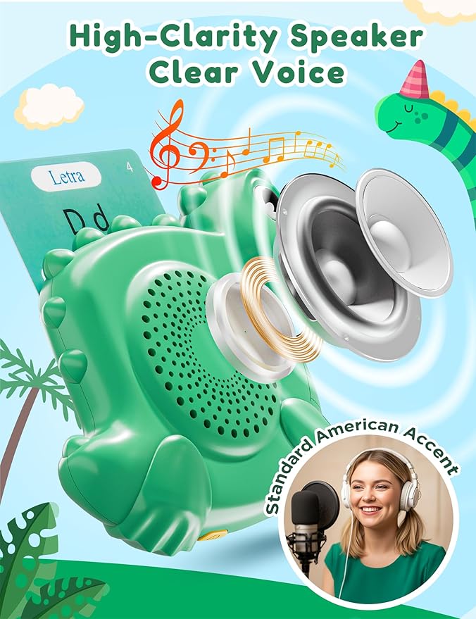 - Interactive Pocket Speech for Toddlers – Designed with a kid-friendly dinosaur shape & made of sturdy ABS material, this portable learning toy fits small hands. Clear American pronunciation & fun sound effects (animal/vehicle noises) enhance language recognition. Great for bilingual families!
