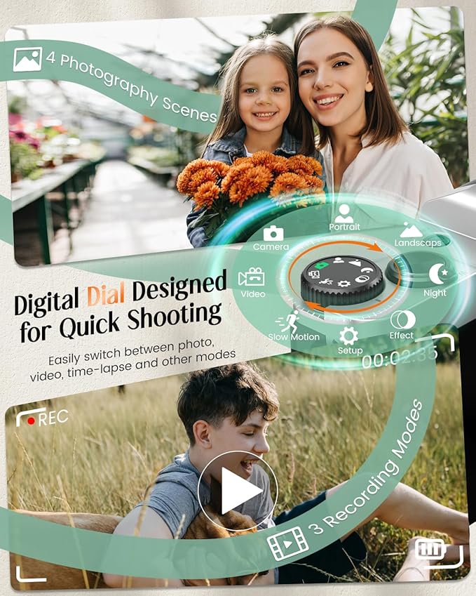 - 【16X Digital Zoom & Creative Shooting Modes】 Use the W/T dial for 16X digital zoom to capture every detail near and far, allowing you to switch between wide landscapes and close-up shots. Explore features such as anti-shake, slow motion, time-lapse, continuous shooting, video pause, face detection, smile capture, and beauty filters to unleash your creativity. Each function is designed to make shooting fun, versatile, and professional.