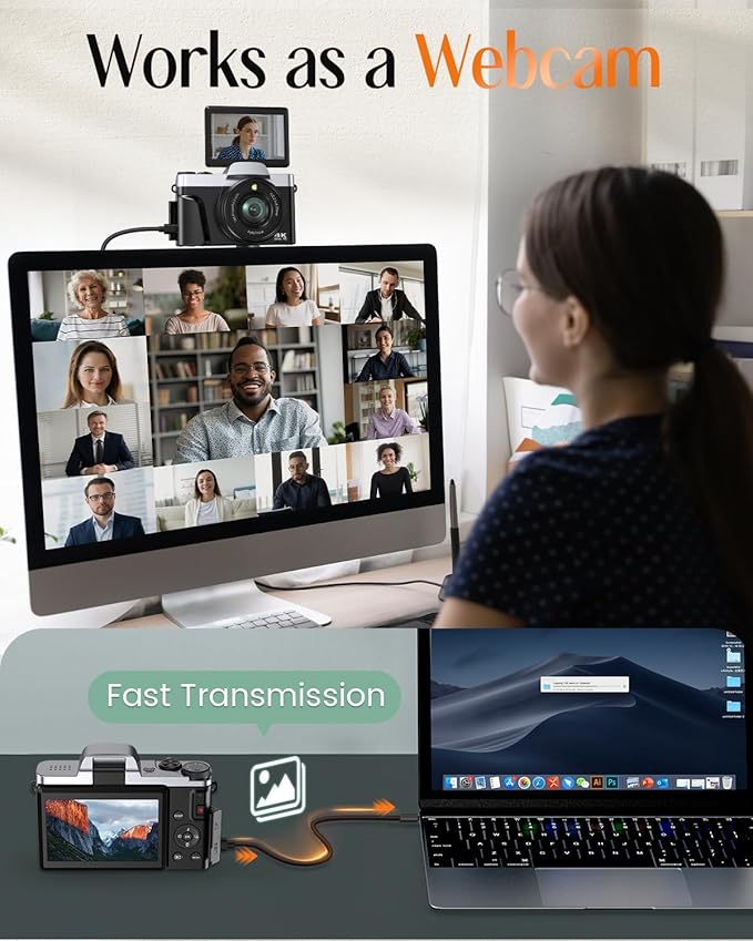 - 【3.0” 180° Flip Screen for Vlogging】 This 4K camera is designed for content creators, featuring a 3.0-inch IPS 180° rotatable flip screen that allows you to preview your shots from any angle, It is perfect for selfies, vlogs, and creative shooting. The built-in microphone ensures clear sound quality, Switch to webcam mode to enjoy live streaming, online classes, video chats, or YouTube content creation, making it an ideal choice for vloggers, beginners, and teenagers.